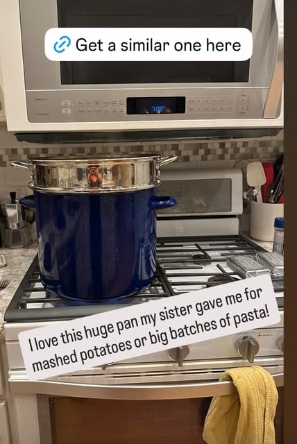 - My sister gave me this huge strainer pan that I LOVE so much. It's great for cooking pasta for large groups or for making a big crock pot of mashed potatoes for Thanksgiving or for anything at all!