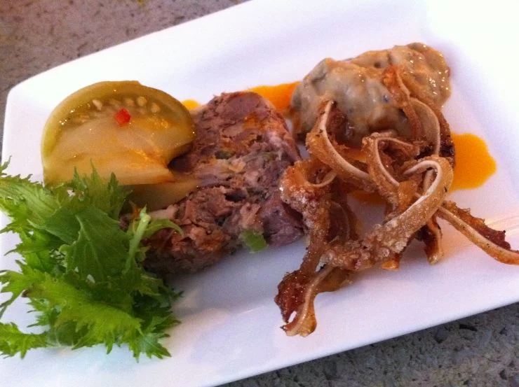So this is pork head cheese with crispy pig ears, house made mustard & pickled green tomatoes: