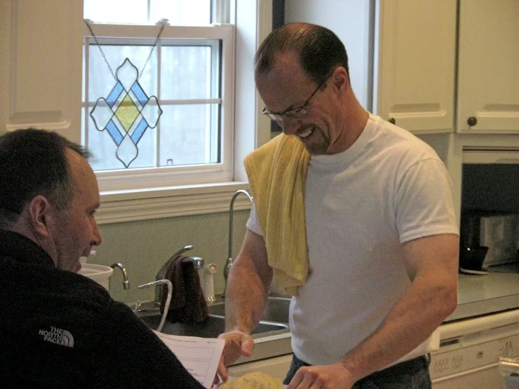 Look at Joe's face, can't you just tell he's making a wisecrack? This is a classic shot of Kent and Joe, too bad you can't see their beer nearby for the total picture. Notice the empty sink behind him? He's always loading and unloading because it bugs him if dirty dishes pile up there (I love his pet peeves like that one!), he has no idea how much I love it when he's got that towel thrown over his shoulder. You-know-what really does begin in the kitchen, right?