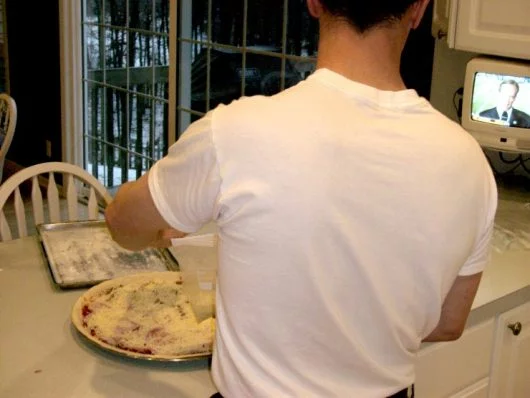 Kent began watching cooking shows on the Food Network about a year ago, and I like them, too. But what I really love is how they inspire him to cook more! Today he made two pizzas, a New York style thin crust pizza and a Gino's Chicago style deep-dish pizza.